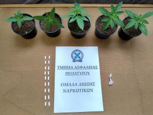 - Συνελήφθη χθες (18 Μαΐου 2018) το απόγευμα σε περιοχή της Χαλκιδικής, από αστυνομικούς της Ομάδας Δίωξης Ναρκωτικών του Τμήματος Ασφάλειας Πολυγύρου, 40χρονος υπήκοος Γερμανίας, καθώς διαπιστώθηκε να καλλιεργεί στην οικία του 5 δενδρύλλια κάνναβης ύψους 15 εκατοστών. Επίσης κατασχέθηκε μικροποσότητα κάνναβης και 18 ναρκωτικά δισκία.