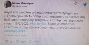 Δείτε το tweet του Γιάννη Οικονόμου για το πρόγραμμα «Εξοικονομώ 2021»: